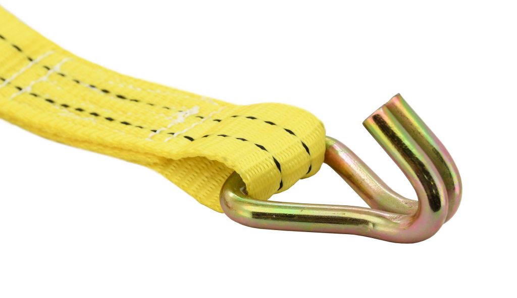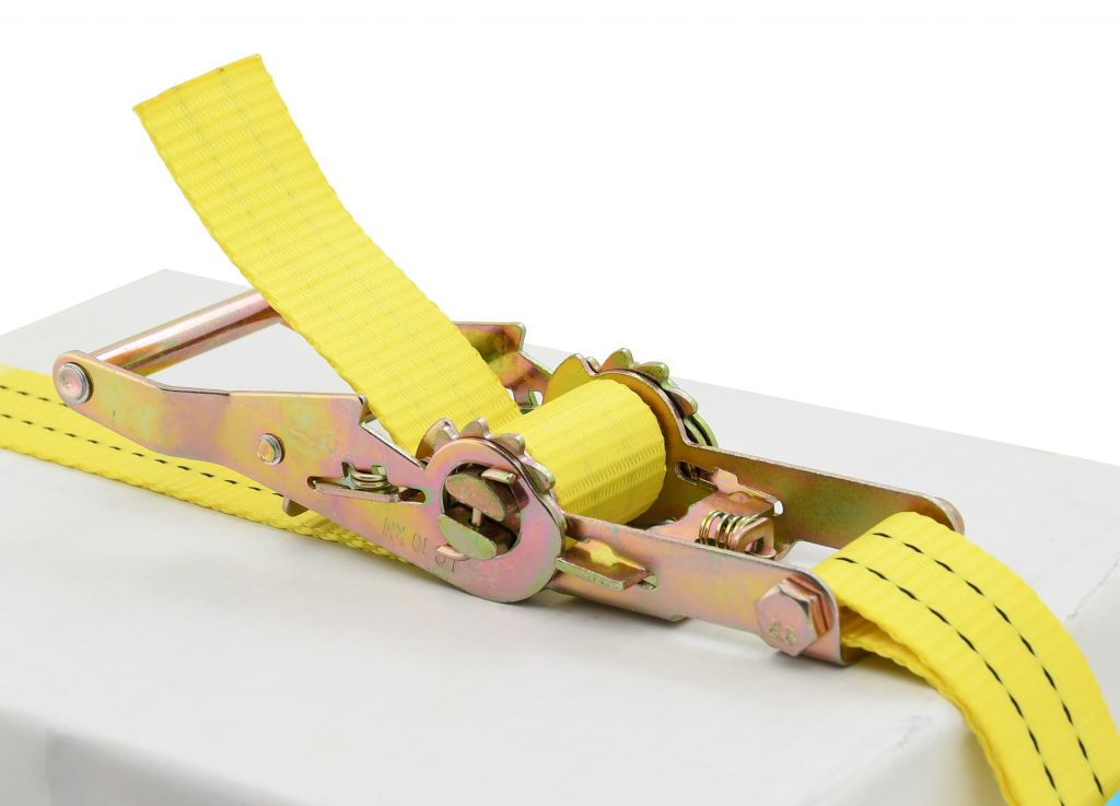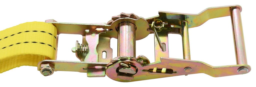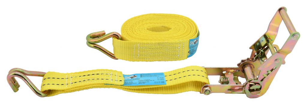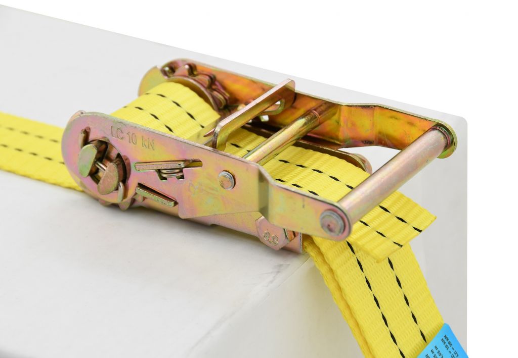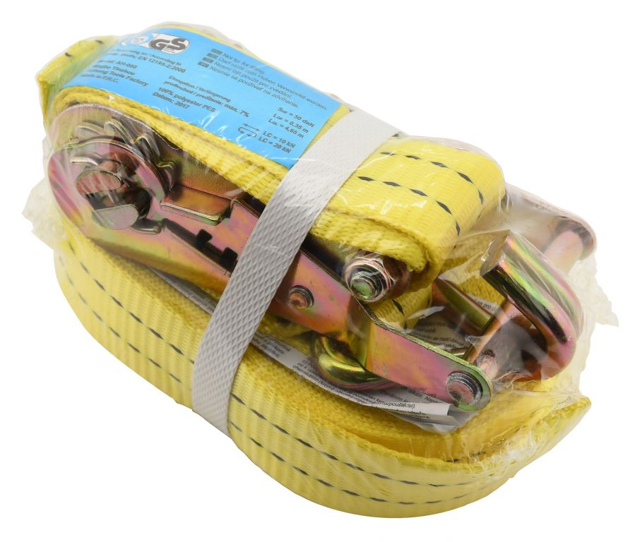 Upínací ráčnový popruh s kovovými háky, s homologací TÜV/GS, pro zajištění těžkého nákladu. Ráčna je celokovová.