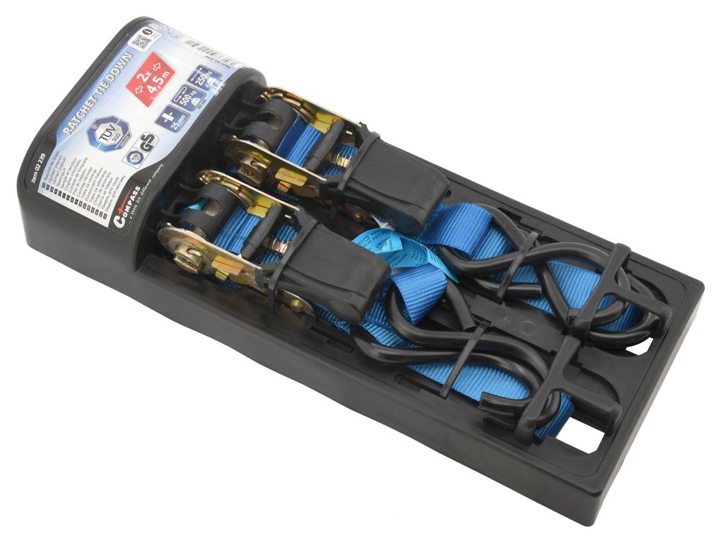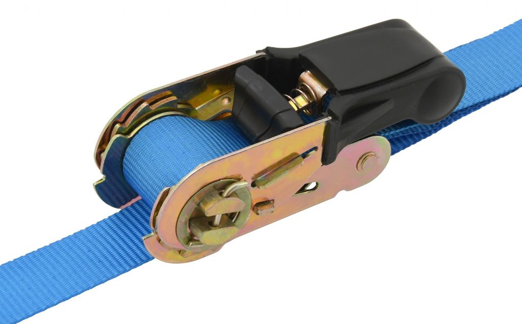 Pro upnutí se využívá celokovová ráčna s jisticím mechanizmem. Konce popruhů jsou osazeny háky, potaženými tvrzeným plastem pro lepší manipulaci. Popruh tak najde široké uplatnění při upevňování předmětů. Zajistěte si správnou bezpečnost nákladu.