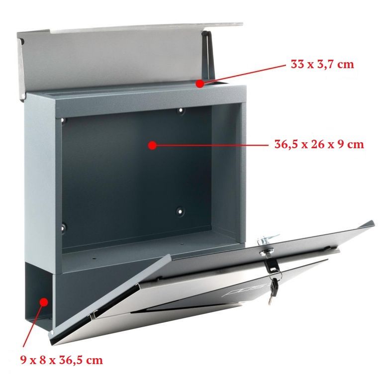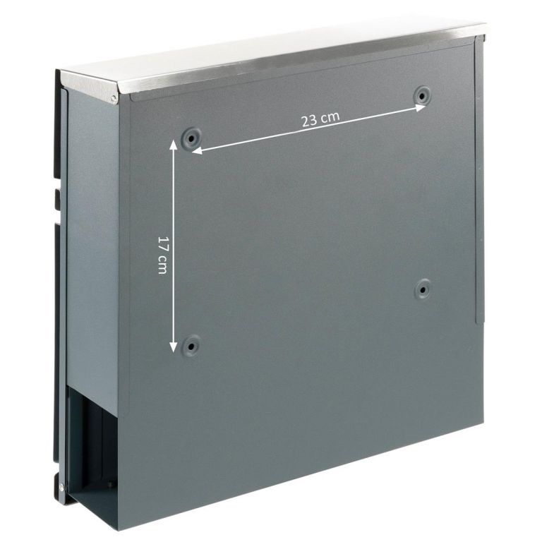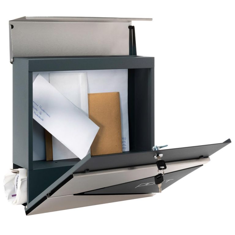 Poštovní schránky jsou vizitkou každého domu. Poštovní schránky nejen přijímají poštu, ale také prezentují váš životní styl. Moderní a přesto nadčasová poštovní schránka v ušlechtilém designu, která vašemu domovu dodá osobní a individuální nádech. Pošta se vhazuje dovnitř horní chlopní, ve které je zabudován slot na dopisy. Ani velké dopisy a časopisy se nemusí ohýbat. K dispozici je navíc novinová přihrádka, která je po obou stranách otevřená. Poštovní schránka je chráněna vačkovým zámkem a vodotěsná klapka uzavírá klíčovou dírku před prvky, jako je např. námraza. Pro vyjmutí pošty lze kryt otevřít jednou rukou směrem dopředu. Práškově lakovaná nerezová ocel nástěnné schránky je vodotěsná, nerezavějící a odpuzující, takže vaše zásilky jsou vždy chráněny před větrem a počasím.