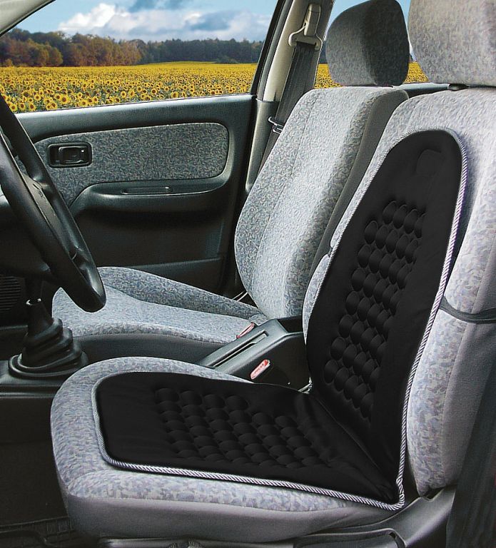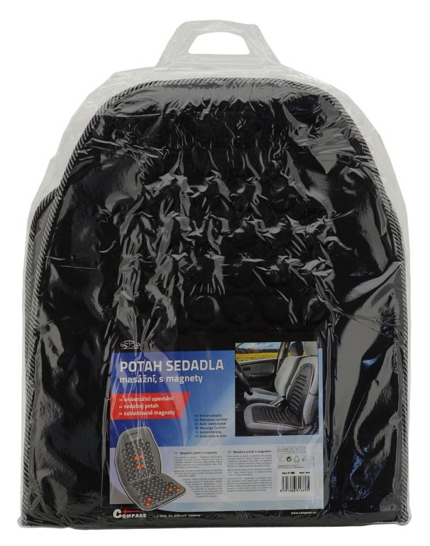 Masážní potah na sedadlo automobilu se zabudovanými magnety a s univerzálním systémem upevnění.