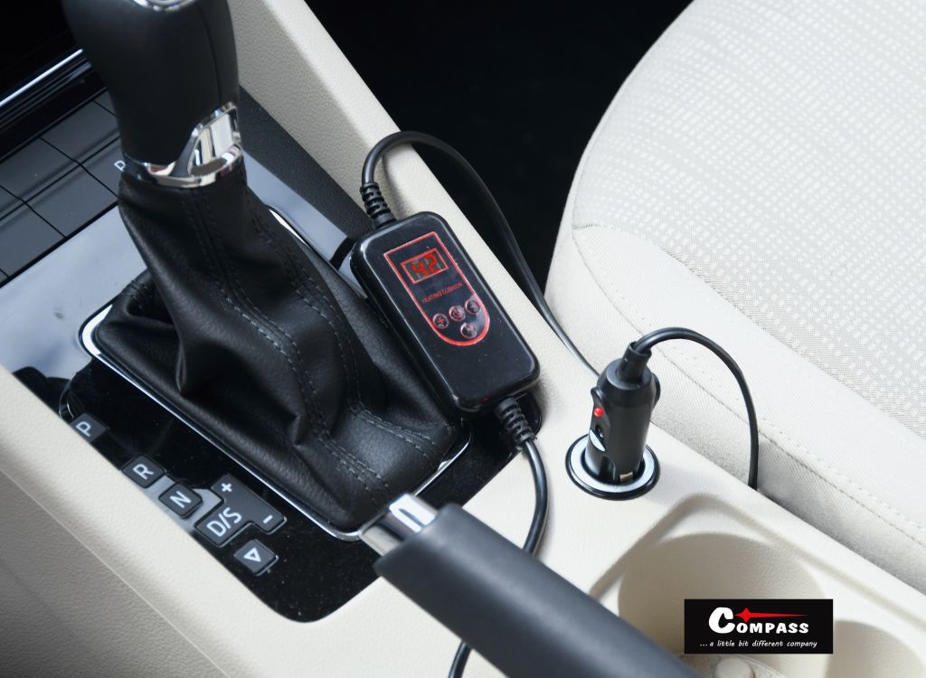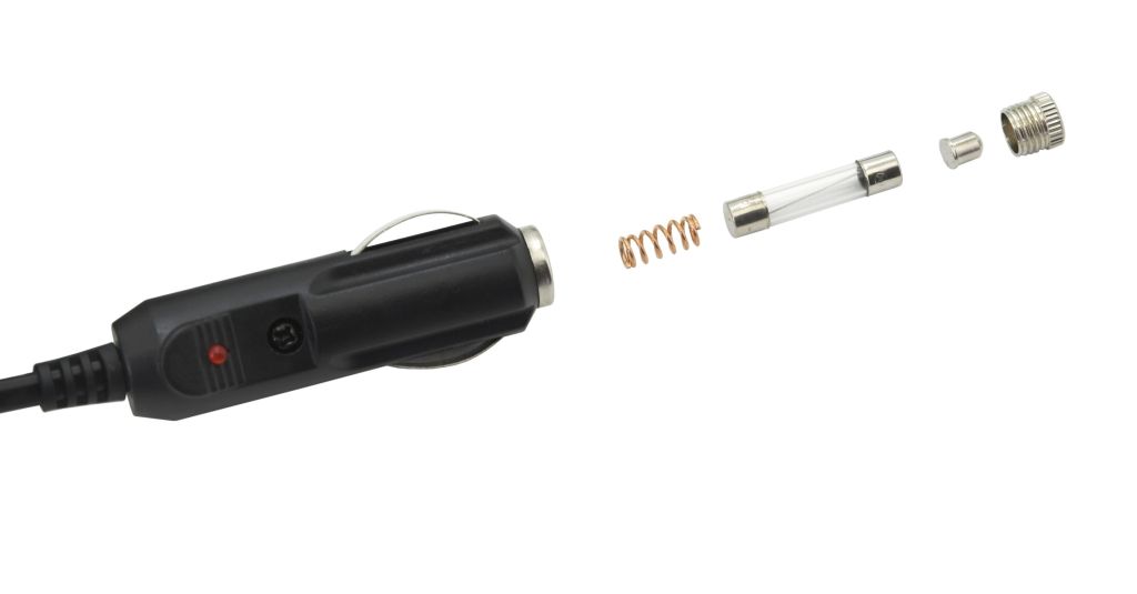Zapojení do běžné zásuvky automobilového zapalovače 12V konektorem. Zásuvka je opatřená skleněnou pojistkou.