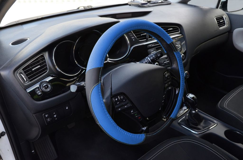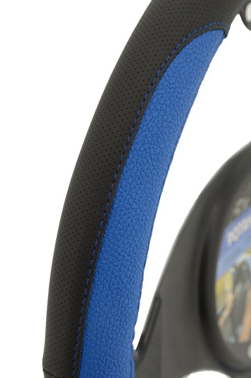 Stylový potah volantu s unikátním provedením, v pastelově modré barvě s černým podkladem a pastelově modrým prošíváním. Potah je příjemný na omak, ergonomicky tvarovaný s perforací pro usnadněný úchop. Potah chrání volant před opotřebením a zlepšuje řízení.