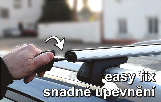Snadné upevnění - nevyžaduje žádné nářadí, stačí odemknout koncovku nosiče, mírně jí vysunout a jejím otáčením příčník upnout či povolit.