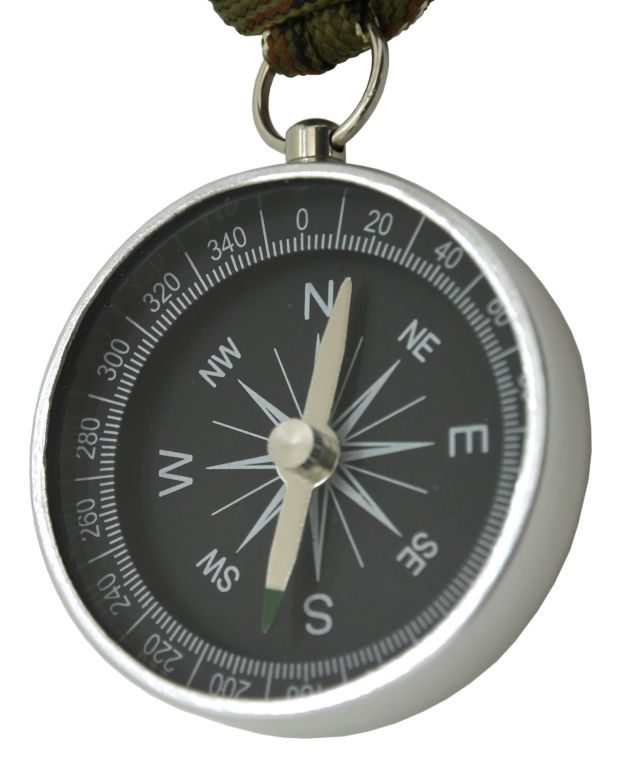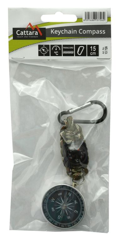 Outdoorový přívěšek s kompasem a teploměrem pro zavěšení za karabinku.