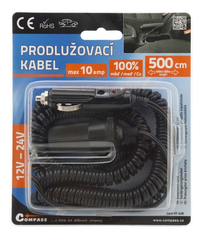 Prodlužovací kabel do zásuvky automobilového zapalovače 12 V nebo 24 V. Kabel je vyroben z kvalitních komponentů, zejména vodičů.