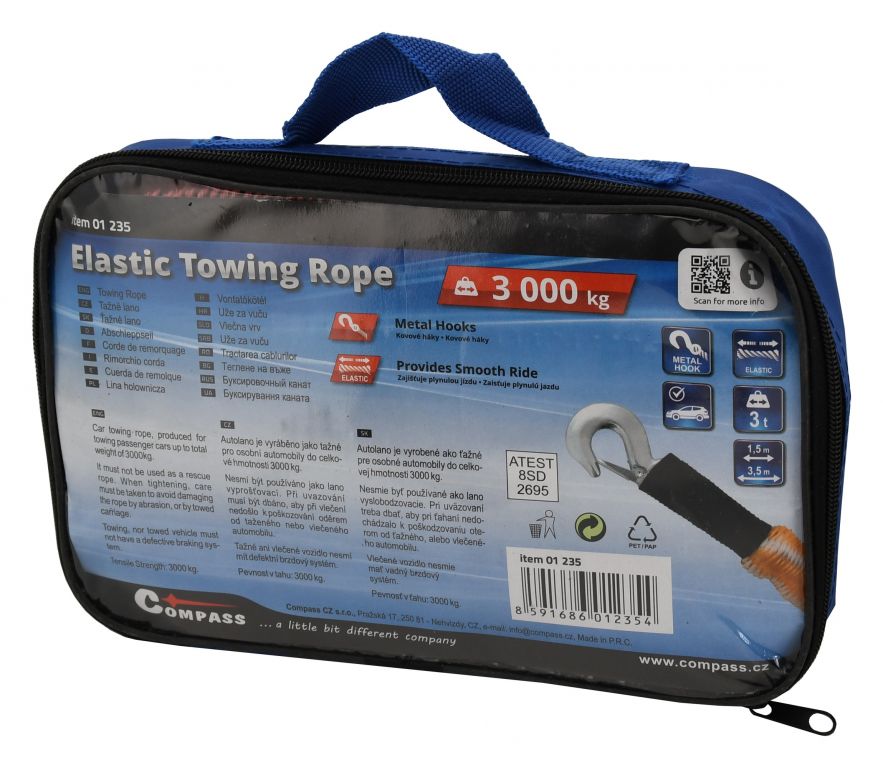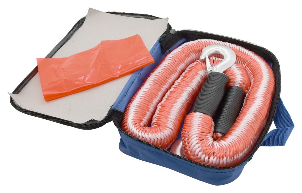 Pružné autolano, tažné lano pro osobní automobily do celkové hmotnosti 3000 kg. Lano je uloženo v praktické na zip uzavíratelné brašně.