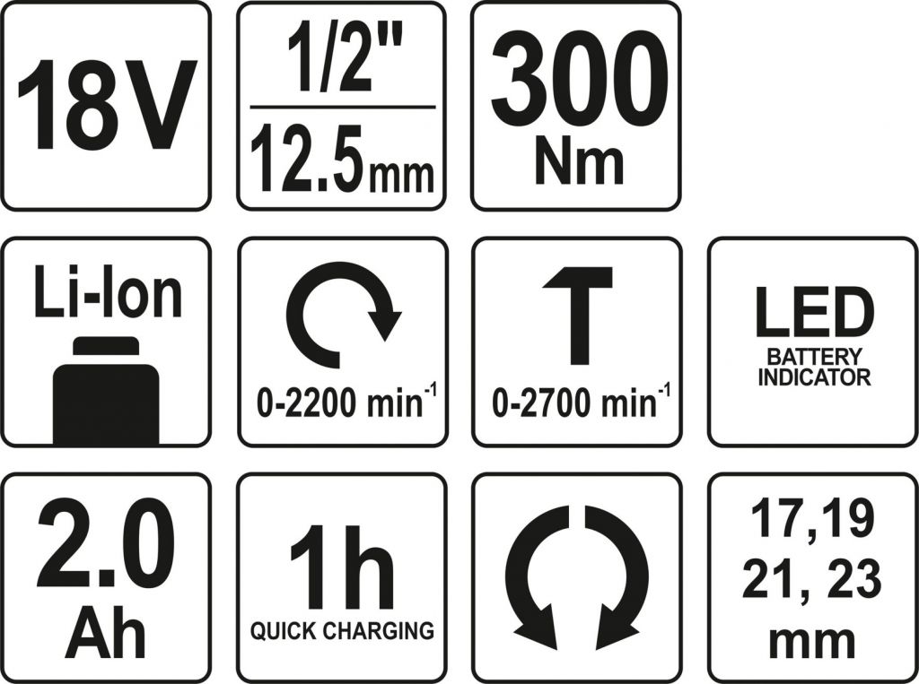 Rázový akumulátorový utahovák pro utahování nebo povolovaní šroubů. Vysoký točivý moment zajišťuje 18V Li-ion akumulátor, který je plně nabitý již po 1 hodině nabíjení. Utahovák má díky spoušti plynule regulovatelné otáčky. Akumulátor je opatřen 4 stupňovou indikací nabití. V sadě v uzavíratelném plastovém kufříku spolu s vyměnitelnými nástavci pro šrouby/matice 17, 19, 21 a 23 mm.