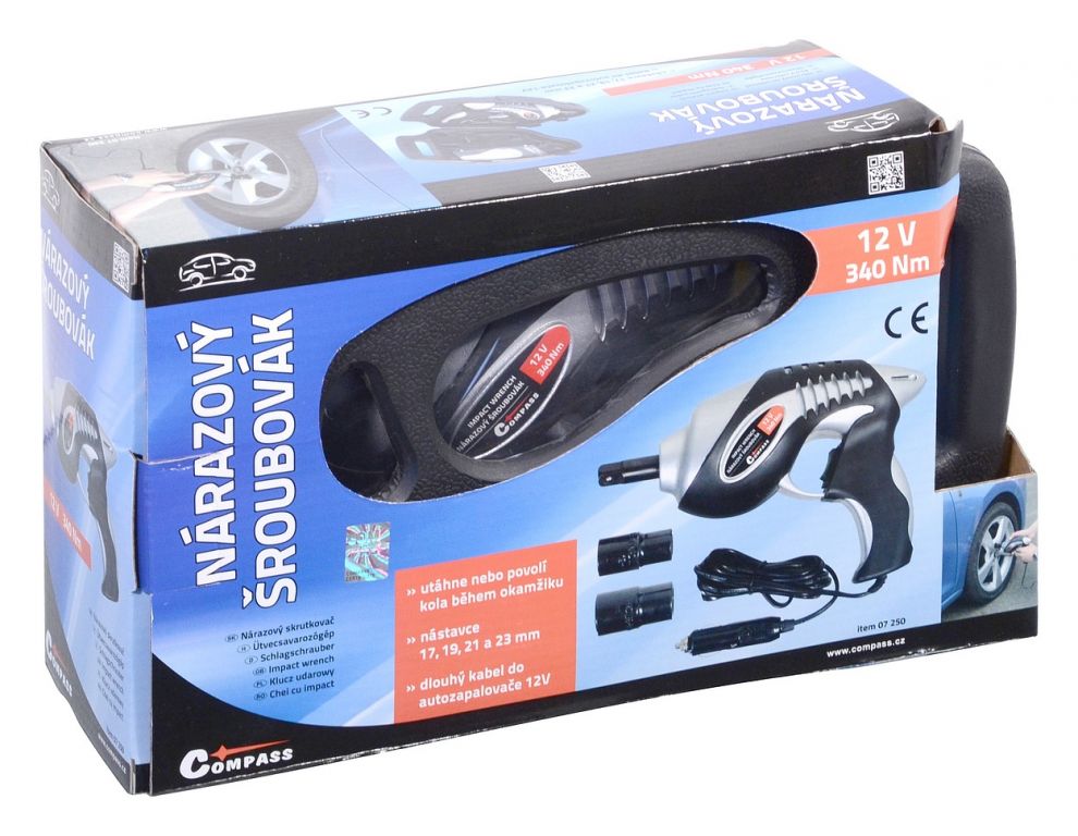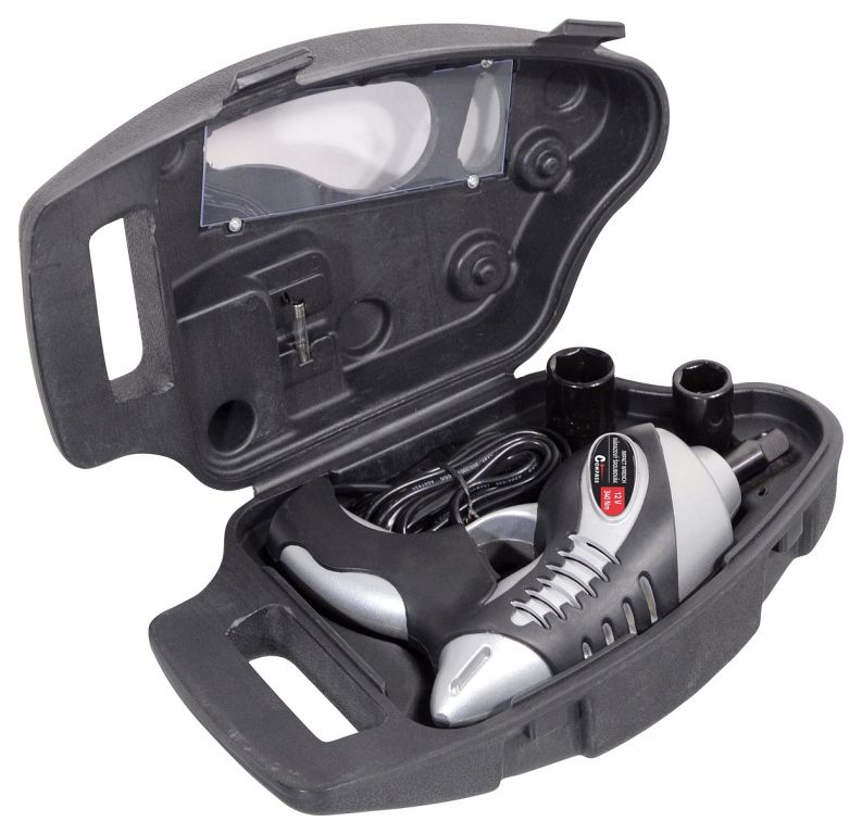 Nárazový šroubovák se zástrčkou do zásuvky automobilového zapalovače 12 V je určen pro povolování a utahování matic či šroubů kol. Je dodáván v uzavíratelném plastovém kufříku a obsahuje vyměnitelné nástavce z chrom-vanadiové oceli. Dlouhý kabel umožňuje pohodlně utáhnout všechny kola vozidla.