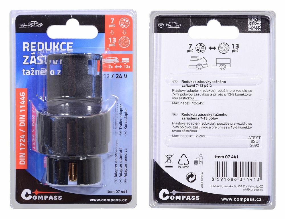 Určeno pro vozidlo s 7-mi pólovou zásuvkou (dle DIN 1724) a přívěs se 13-ti konektorovou zástrčkou (dle DIN 11446). 7mi pólové zásuvky a zástrčky se obvykle používají u starších vozidel a přívěsů, 13ti pólové pak u nových tažných zařízení a přívěsů.