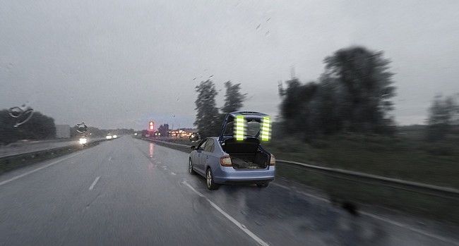 Ideální doplněk k výstražnému trojúhelníku – jen se pomocí magnetů přichytí na auto, které je za snížené viditelnosti lépe viditelné.