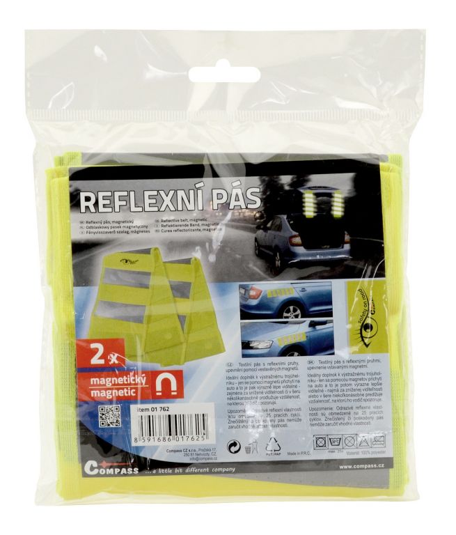 Textilní pás s reflexními pruhy, upevnění pomocí vestavěných magnetů. Vhodný zejména za snížené viditelnosti či v šeru. Reflexní pás několikanásobně prodlužuje vzdálenost, na kterou jej řidič zpozoruje.