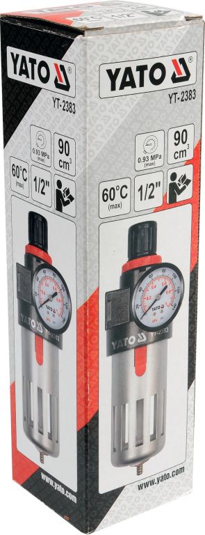 Regulátor tlaku vzduchu Yato YT-2383 s odlučovačem vody, s rozsahem regulace vzduchu 0 - 9,3 bar.
