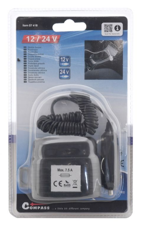 Rozdvojka zásuvky automobilového zapalovače 12 V nebo 24 V. Umožňuje připojení dvou spotřebičů k jedné standardní zásuvce zapalovače v automobilu. Potěší každého řidiče.