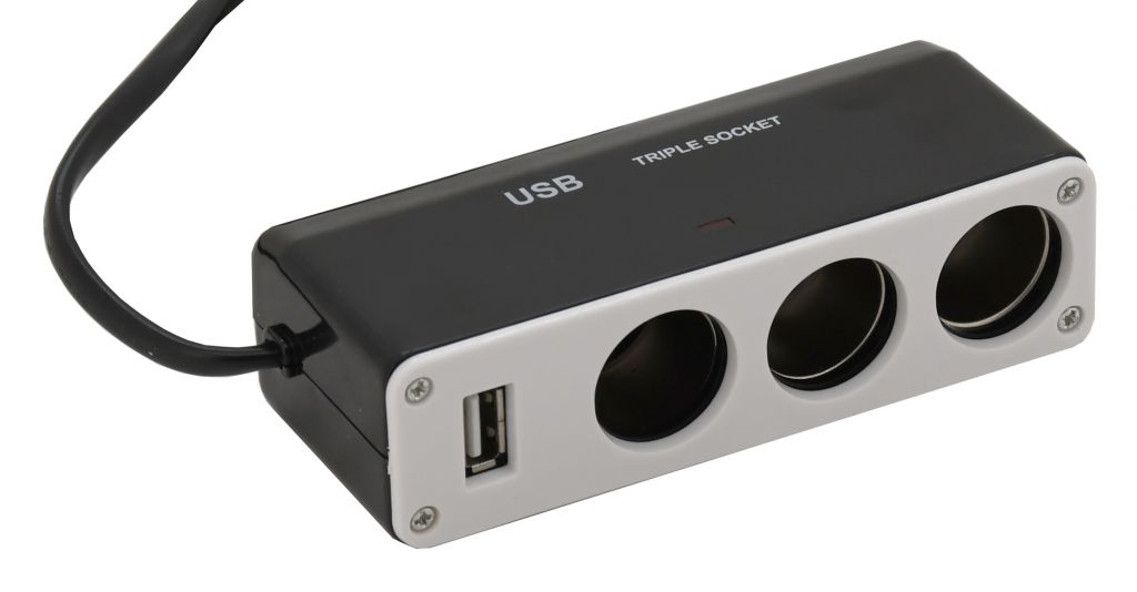 Roztrojka zásuvky zapalovače 12/24 V s USB konektorem, umožňuje připojení více spotřebičů k jedné standardní zásuvce zapalovače v autě.