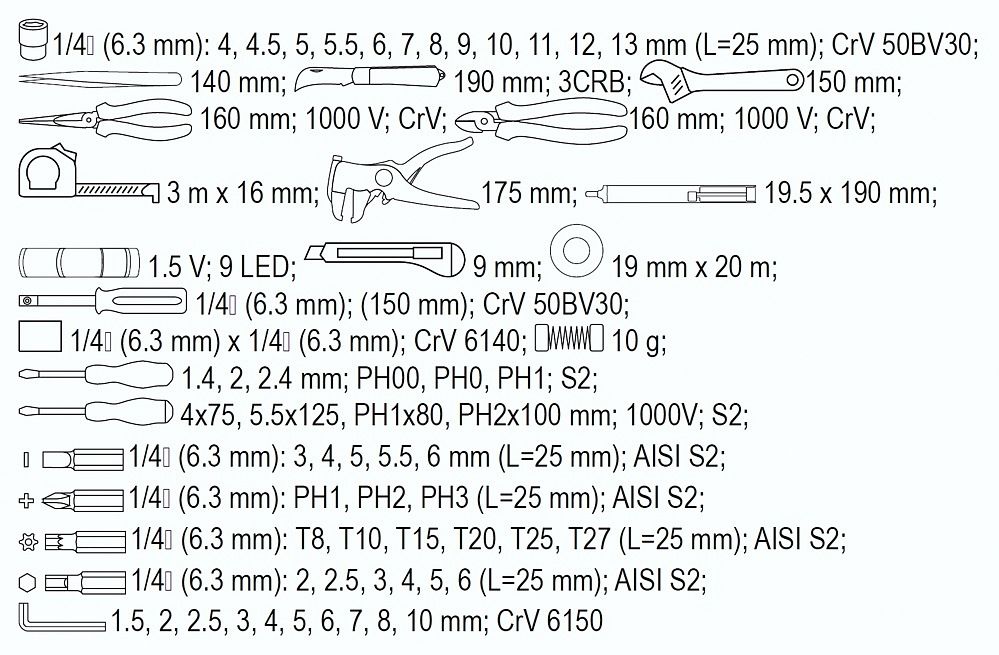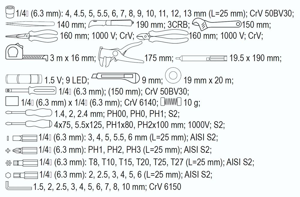 Zobrazit podrobnější popisProfesionální sada elektro nářadí YATO pro elektrikáře. Vhodná do každé dílny. Vykouzlíte s ni úsměv každému kutilovi.