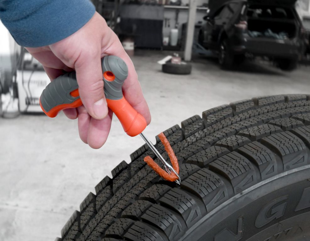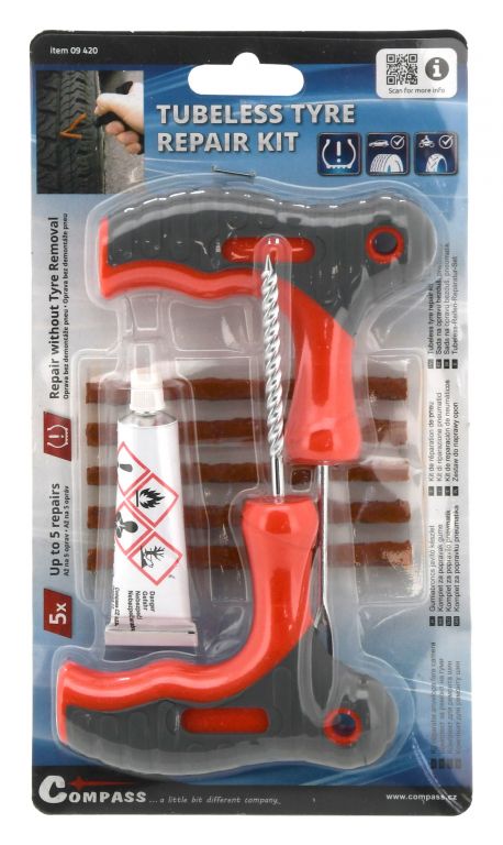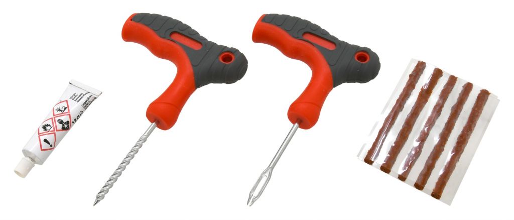 Ergonomická sada pro rychlé opravy bezdušových pneumatik, bez nutnosti demontáže pláště z disku. Tato sada je vhodná jak pro automobily a motocykly, tak pro čtyřkolky a další vozidla s bezdušovými pneumatikami. Součástí balení je: průtažník (vrták), vidlice na knot, 5x opravný knot a vulkanizační roztok.