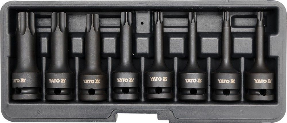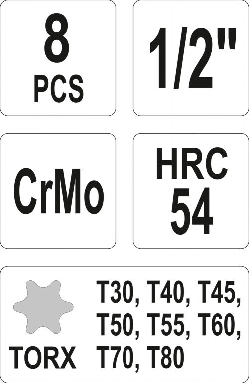 Sada kovaných ořechů torx T30, T40, T45, T50, T55, T60, T70, T80, s vnitřním čtyřhranem 1/2", celková délka 78mm. Vyrobeno z vysoce kvalitní chrom-molybdenové slitiny tvrdosti HRC54.