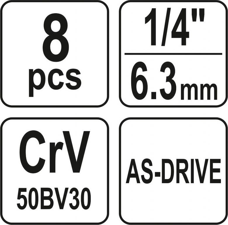 Nástavce byly vyrobeny kováním, před kalením byly podrobeny kalibrací kontrolním zařízením s přesným měřením. Sada vybavena systémem AS-DRIVE - vnitřní profil je tvarován do mírného obloučku. Tím při záběru hlavní síla nepůsobí přímo na hranu šroubu, ale na plochu, což významným způsobem snižuje opotřebení šroubu a pomáhá při demontáži již poškozených šroubů. Obsahuje nástavce 5; 5,5; 6; 7; 8; 9; 10; 12 ; 13