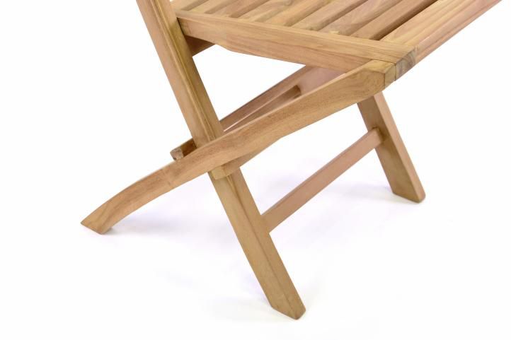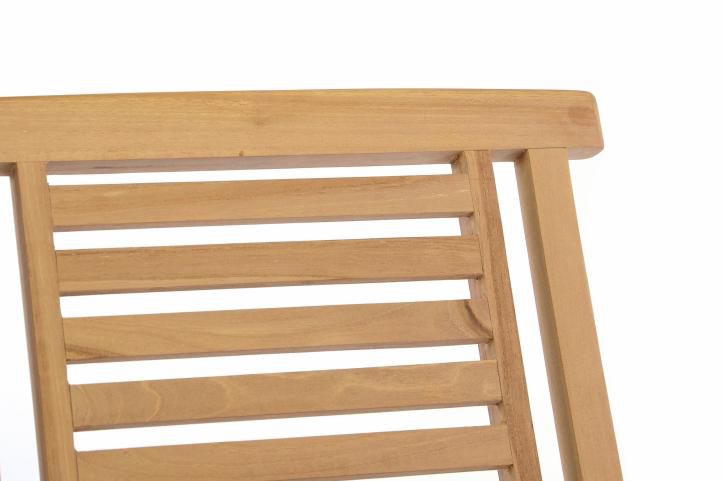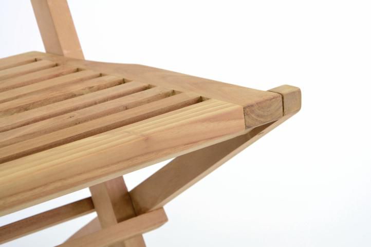 Masivní sklopná židle z teakového dřeva je perfektním řešením pro malou terasu nebo balkon. Je postavena během pár sekund a velmi pohodlná k sezení i bez polštáře díky zaobleným hranám a úzkým latím. Tento model je stabilní díky zesíleným vzpěrám ve spodní části a odolnému teakovému dřevu. Povrch je několikrát broušený. Naše zahradní židle je sklopná a umožňuje jednoduché a úsporné skladování. Dřevěný nábytek má jako přírodní produkt zvláštní auru, prezentuje přirozenost, pohodlí, stálost a nadčasovou eleganci. Teakové dřevo se vyznačuje odolností proti vlivům počasí a proto je velmi vhodné k použití ve venkovních prostorách. K udržení teplého tónu dřeva doporučujeme pravidelnou údržbu židlí teakovým olejem. Neošetřené teakové dřevo získá po určité době známou stříbrnošedou patinu. Nezapomeňte na to! Dřevo je živý materiál, který pracuje, drobné prasklinky a pozvolná změna barvy patří k normálním vlastnostem tvrdých dřevin. Na výrobu námi nabízených produktů se používá pouze dřevo z kontrolovaných pěsteb. Samozřejmě naleznete v našem e-shopu vedle vhodných potahů i vhodný teakových olej pro péči o Vaší zahradní židli a další produkty k tématu dům a zahrada.
