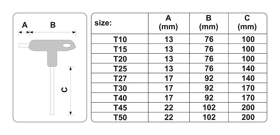 Sada klíčů v provedení T šroubovák, osazený 2x torx (hvězdička) klíčem s otvorem (1x dlouhý, 1x krátký) a ergonomickou rukojetí, díky které je jeho použití opravdu snadné. Vyrobeno z oceli S2, která zaručuje dlouhou životnost.