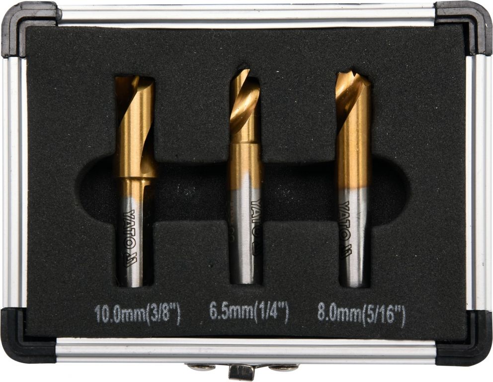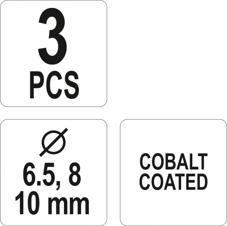 Sada je složena ze tří kusů vrtáků, uložených v pouzdře, s průměry 6,5; 8 a 10 mm.