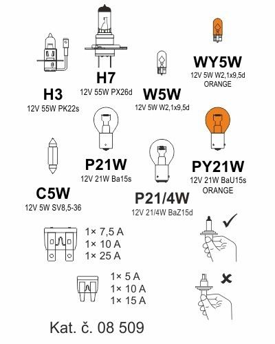 Náhradní autožárovky a pojistky na Škoda Fabia I. v plastovém servisním boxu, který je vyroben z PVC. Homologace E.