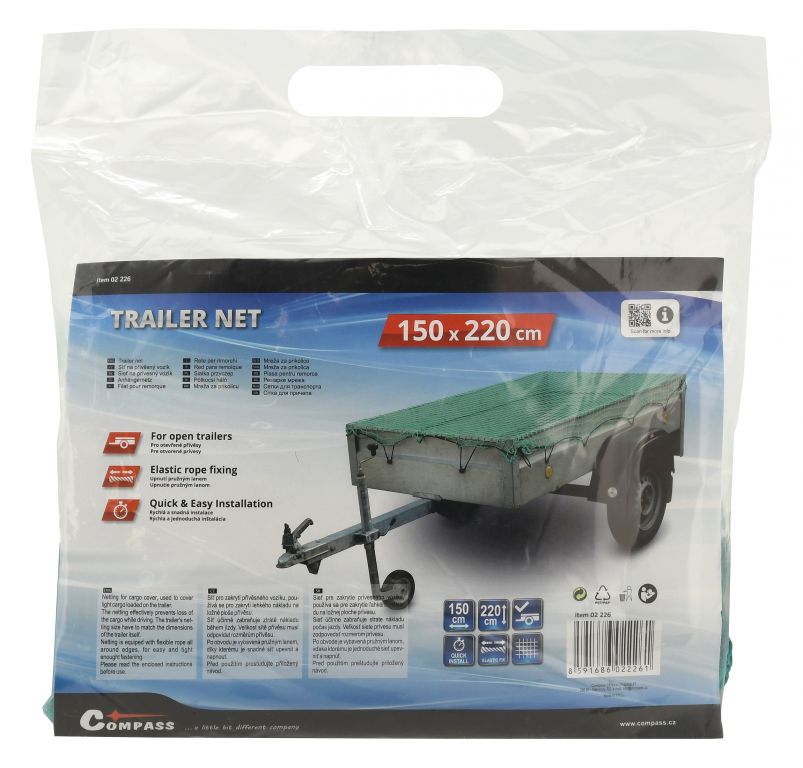 Síť je zhotovena z odolného polypropylenu zelené barvy a je po obvodu opatřena pružným lanem, pro snadné a rychlé upevnění a napnutí. Velikost sítě musí odpovídat rozměrům přívěsu, tato síť má rozměry 150 x 220 cm s oky čtvercového tvaru s rozměry 4 x 4 cm.