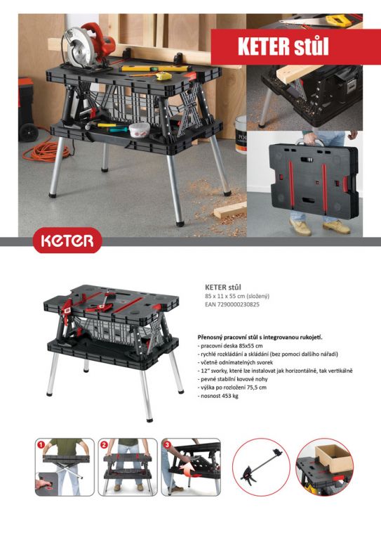 Přenosný pracovní stůl s integrovanou rukojetí a pracovní deskou 85 x 55 cm. Rychlé rozkládání a skládání (bez pomoci dalšího nářadí) včetně odnímatelných svorek, které lze instalovat jak horizontálně, tak vertikálně. Pevné stabilní kovové nohy a výška po rozložení 75,5 cm s nosností 453 kg.