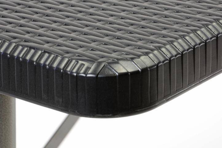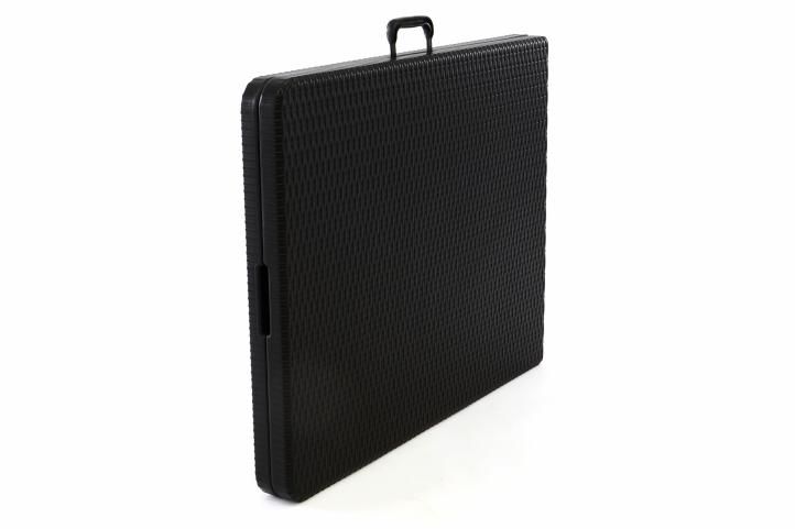 Černý sklopný stůl s elegantním ratanovém designu upoutá pozornost. Je postaven během okamžiku, stabilitu zajišťují imbusy upevněné na spodní straně. Stůl si můžete sebou vzít i na party, díky integrovanému úchytu jej můžete lehce transportovat. Pro případ, že stůl momentálně nepotřebujete, můžete ho úsporně uskladnit. Materiál je nenáročný na údržbu a nechá se snadno omývat. Je vhodný jak pro vnitřní tak i venkovní prostory. Tím Vašim oslavám nestojí nic v cestě.