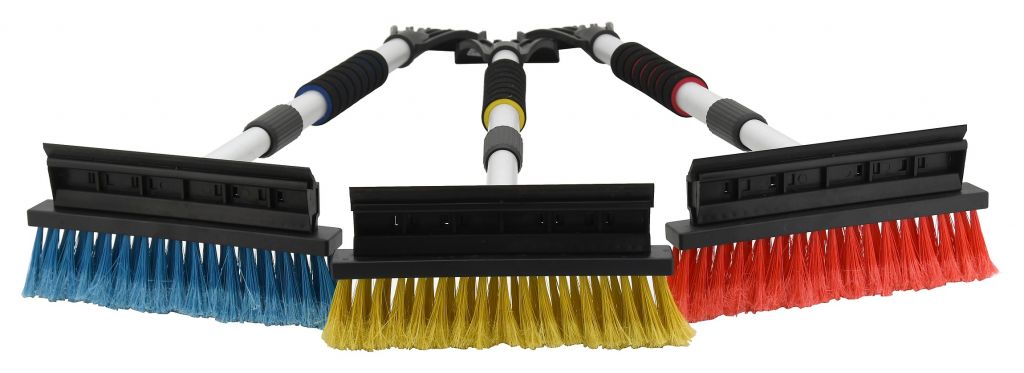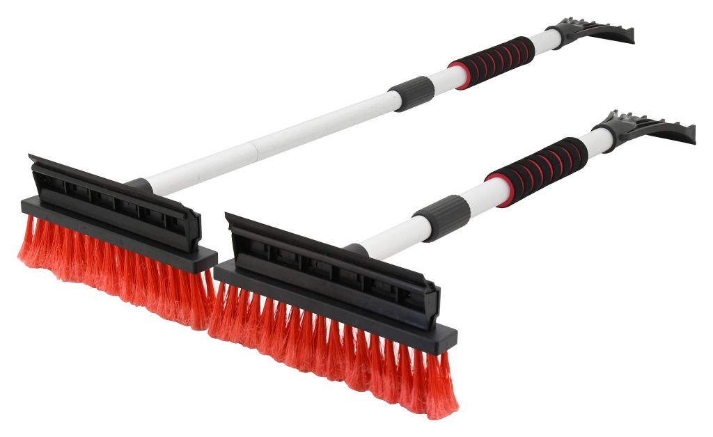 Škrabka s košťátkem teleskopická délky 60 - 90 cm. Jeden konec je opatřen košťátkem šíře 24 cm a gumovou stěrkou šíře 20 cm z druhé strany. Na druhém konci rukojeti se nachází 10 cm škrabka. Teleskopickou násadu lze po pootočení vysunout, nebo zasunout, po nastavení požadované délky je třeba otočit v opačném směru, pro zajištění. Hliníkové zhotovení rukojeti je opatřeno pěnovým madlem pro kvalitní a pohodlný úchop. Produkt je nabízen v kombinacích barev modré, žluté a červené s černou. Konkrétní barvu nebo druh výrobku není možné z technických důvodů zvolit, objednávce bude přidělena náhodná varianta dle skladových možností.