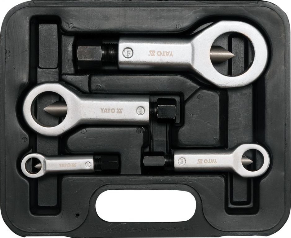 Sada přípravků pro demontáž poškozených a zrezlých matic. V soupravě jsou 4 odstupňované hlavice pro demontáž matic od 9 - 27 mm.