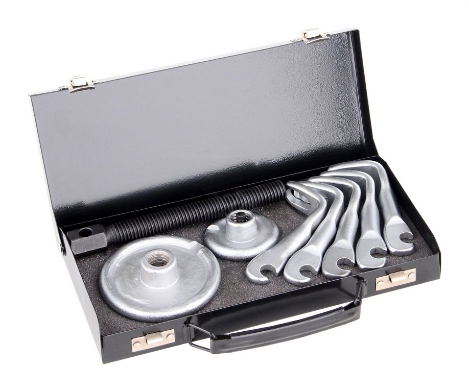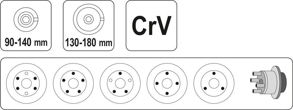 Stahovák na brzdové bubny, kotouče a příruby průměru 90 - 180 mm. Veškeré příslušenství, z kvalitní CrV oceli, je uloženo v kovovém kufru.