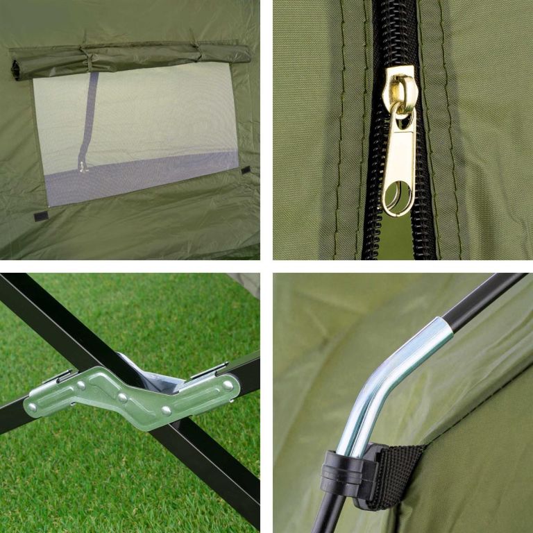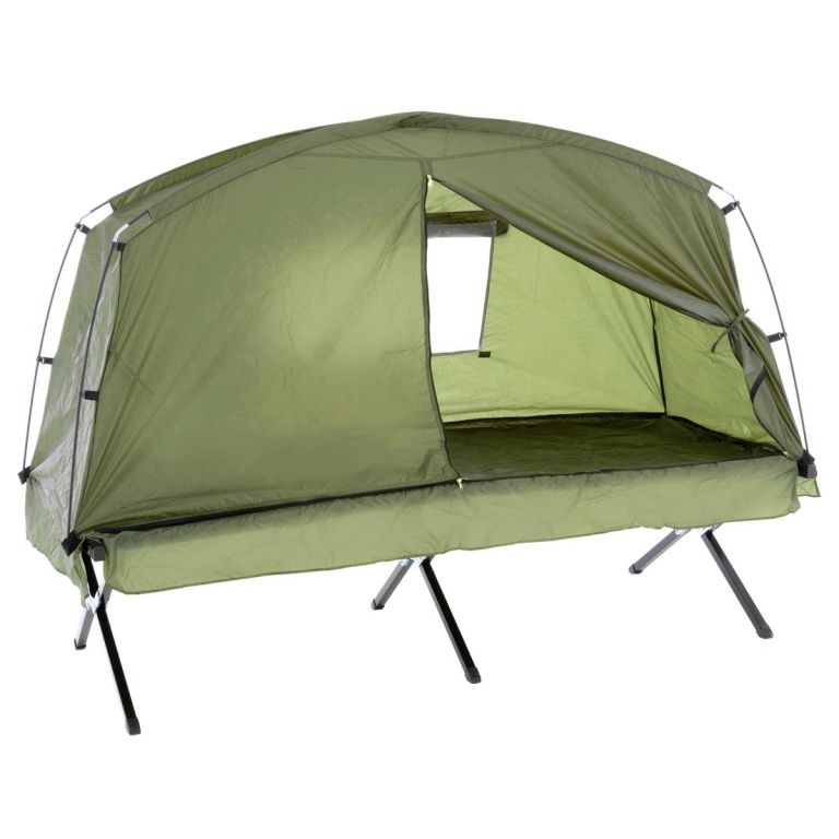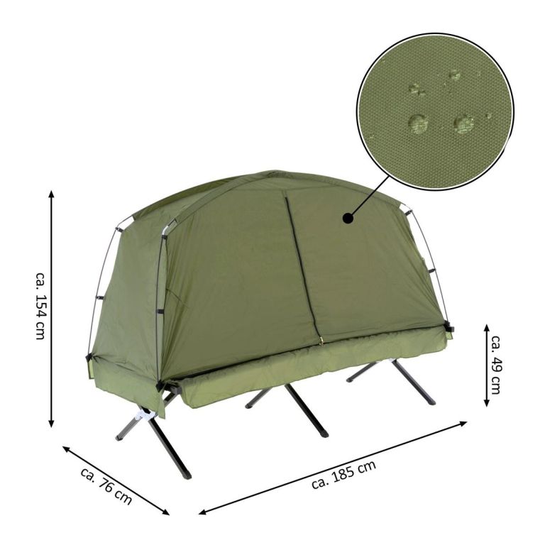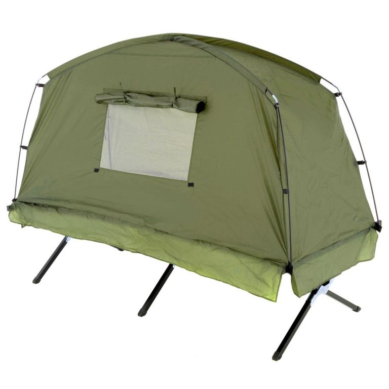 Ocelový rám poskytuje pevné postavení na jakémkoliv povrchu, na pláži v písku, na louce i kamenech. Pro ještě pohodlnější spánek nabízí vysoký stan dostatek místa pro izolační podložku nebo matraci jako přídavnou podložku. Okno se sítí proti komárům poskytuje útulnou atmosféru a přívod čerstvého vzduchu, zároveň však chrání před nepříjemným hmyzem. Stan lze uzavřít zipem. Stan s lehátkem se snadno a rychle postaví. Kempovací postel a venkovní stan lze použít samostatně.