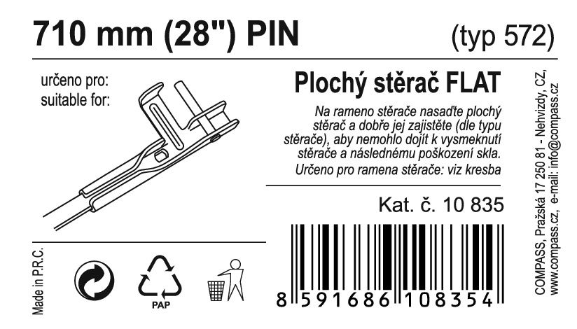 Plochý stěrače FLAT v servisním (průmyslovém) balení, uchycení uzpůsobeno pro daný typ ramena stěrače. Stěrač je balen pouze v papírovém obalu „papper roll", ze kterého je možné stěrač jednoduše vyndat (prohlédnout si jej, vyzkoušet), a případně jej vrátit zpět do obalu. Každé balení stěrače je opatřeno štítkem s označením (včetně délky, čárového kódu i vyobrazení typu ramínka, na který jej lze použít).