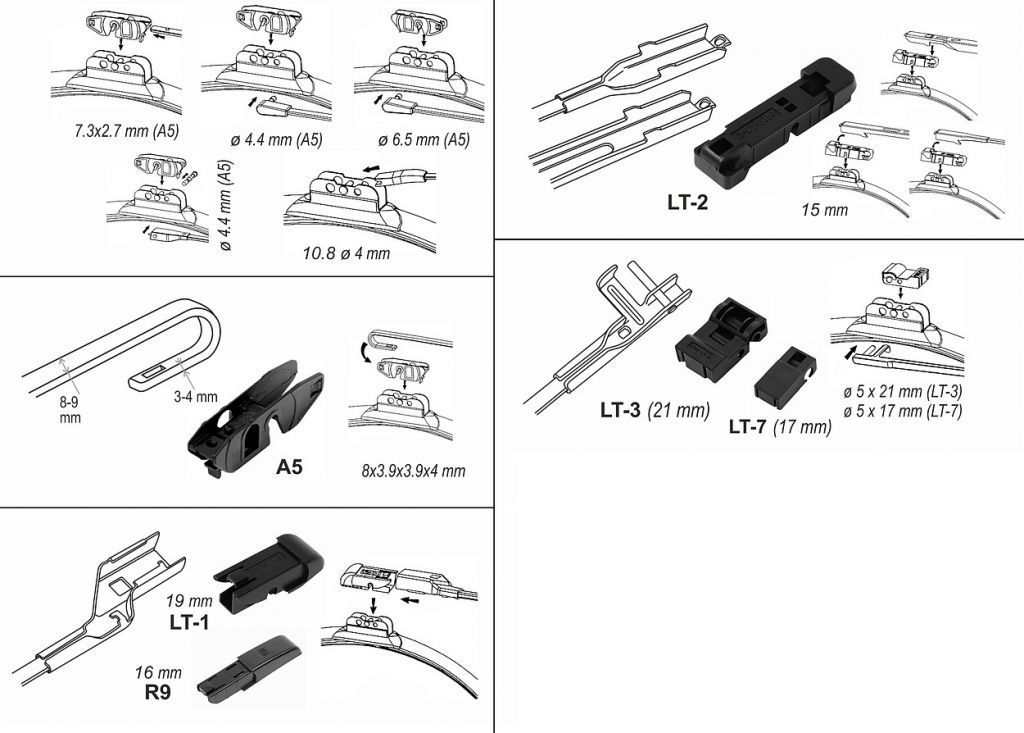 Speciální uchycení, díky kterému lze pomocí přiložených adaptérů použít tento stěrač pro řadu různých zakončení ramen stěračů. Balení jednoko kusu strače je ve speciálním "otevíracím" blisteru. Gumičku s černým grafitem lze vyměnit.