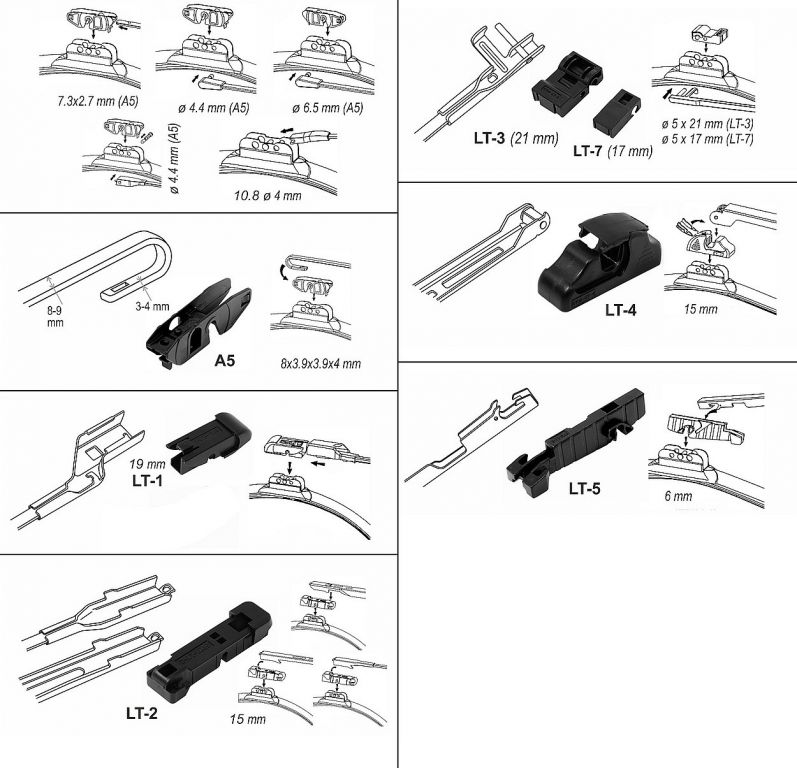 Speciální uchycení, díky kterému lze pomocí přiložených adaptérů použít tento stěrač pro řadu různých zakončení ramen stěračů. Balení jednoko kusu strače je ve speciálním "otevíracím" blisteru. Gumičku s černým grafitem lze vyměnit.