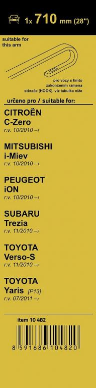 Plochý stěrač Flat (na přední okno) se speciálním uchycením. Vysoce kvalitní pružný člen plochého stěrače zajišťuje stejnoměrný tlak grafitového břitu v celé jeho délce, což zamezuje rozmazávání nečistot a vytváření pruhů. Délka stěrače a systém uchycení na ramínko je přizpůsobena těmto vybraným vozům: Citroën C-Zero 10/10, Mitsubishi i-Miev 10/10, Peugeot iON 10/10, Subaru Trezia 11/10, Toyota Verso-S 11/10, Toyota Yaris [P13] 07/11