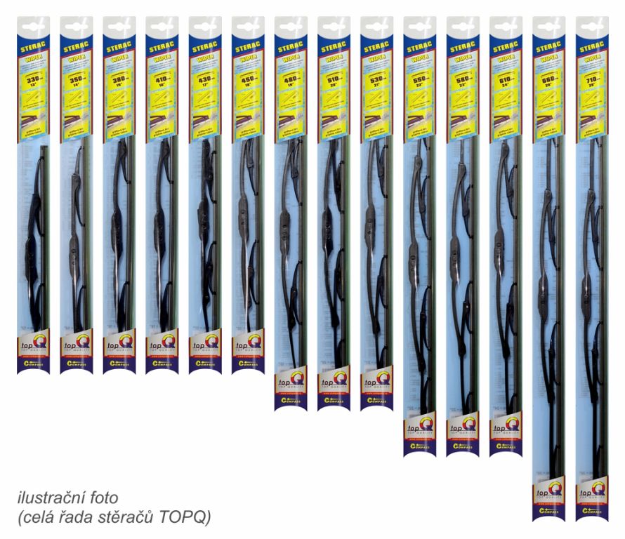 Masivní kvalitní celokovový stěrač TOP Q s grafitovým břitem. Tento stěrač je konstruován s vyváženým počtem vahadel tak, aby zajistil dokonalý přítlak a spolu s grafitovým břitem i dokonalé stírání s dlouhou životností.