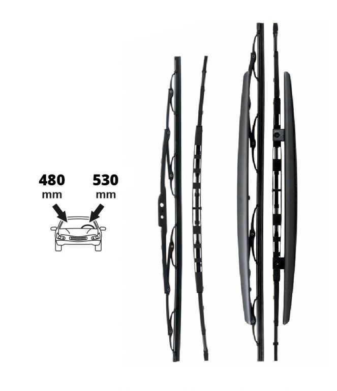 Sada dvou stěračů (řidič + spolujezdec) rozdílných délek, optimalizovaná pro nejběžněji používanou kombinaci velikostí stěračů. Stěrač určený k montáži před řidičem se spoilerem. Stěrač určený k montáži před spolujezdcem je prohnutý. Zajišťuje dokonalé stírání i na zakřivené části skla na straně spolujezdce. Kvalitní vícevahadlová nýtovaná konstrukce ramena stěrače. Vhodné především pro vozy Škoda (Octavia I, Fabia I), VW, Seat, Audi a Ford (Focus). Balení obsahuje stěrač 530 mm (21") + stěrač 480 mm (19") + univerzální adaptéry pro montáž.