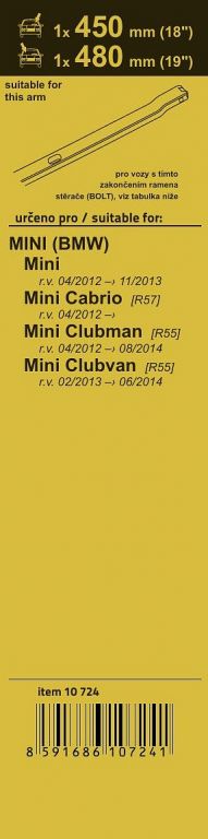 Sada dvou plochých stěračů typu Flat (řidič + spolujezdec) se speciálním uchycením. Dopřejte si zásobu těchto kvalitních stěračů. Délky stěračů a systém uchycení na ramínko jsou přizpůsobeny těmto vybraným vozům - MINI (BMW) Mini 04/12 - 11/13, MINI (BMW) Mini Cabrio [R57] 04/12, MINI (BMW) Mini Clubman [R55] 04/12 - 08/14, MINI (BMW) Mini Clubvan [R55] 02/13 - 06/14