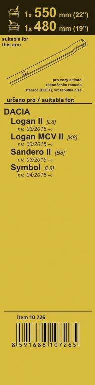Sada dvou plochých stěračů typu Flat (řidič + spolujezdec) se speciálním uchycením. Dopřejte si zásobu těchto kvalitních stěračů. Délky stěračů a systém uchycení na ramínko jsou přizpůsobeny těmto vybraným vozům - Dacia Logan II [L8] 03/15, Dacia Logan MCV II [K8] 03/15, Dacia Sandero II [B8] 03/15, Renault Symbol [L8] 04/15 -