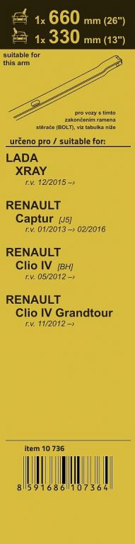 Sada dvou plochých stěračů typu Flat (řidič + spolujezdec) se speciálním uchycením. Dopřejte si zásobu těchto kvalitních stěračů. Délky stěračů a systém uchycení na ramínko jsou přizpůsobeny těmto vybraným vozům - Lada XRAY 12/15, Renault Captur [J5] 01/13 - 02/16, Renault Clio IV [BH] 05/12, Renault Clio IV Grandtour [KH] 11/12