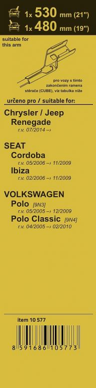 Sada dvou plochých stěračů typu Flat (řidič + spolujezdec) se speciálním uchycením. Dopřejte si zásobu těchto kvalitních stěračů. Délky stěračů a systém uchycení na ramínko jsou přizpůsobeny těmto vybraným vozům - Chrysler / Jeep Renegade 07/14, Seat Cordoba 05/06 - 11/09, Seat Ibiza 02/06 - 11/09, VW Polo [9N3] 05/05 - 12/09, VW Polo Classic [9N4] 04/05 - 02/10