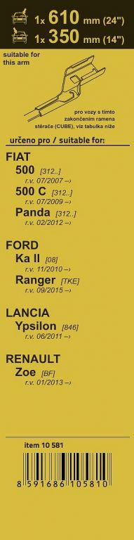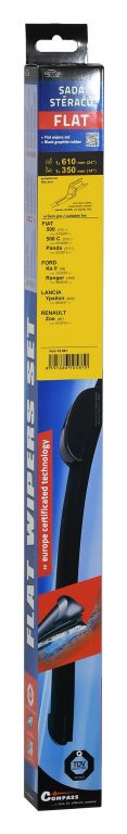 Sada dvou plochých stěračů FLAT (řidič + spolujezdec) se speciálním uchycením. Délky stěračů a systém uchycení na ramínko jsou přizpůsobeny vybraným vozům (viz tabulka použití). Vysoce kvalitní pružný člen plochého stěrače zajišťuje stejnoměrný tlak grafitového břitu v celé jeho délce, což zamezuje rozmazávání nečistot a vytváření pruhů.