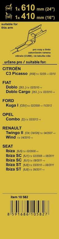 Sada dvou plochých stěračů FLAT (řidič + spolujezdec) se speciálním uchycením. Délky stěračů a systém uchycení na ramínko jsou přizpůsobeny vybraným vozům (viz tabulka použití). Vysoce kvalitní pružný člen plochého stěrače zajišťuje stejnoměrný tlak grafitového břitu v celé jeho délce.