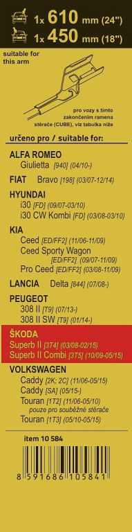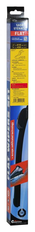 Sada dvou plochých stěračů FLAT (řidič + spolujezdec) se speciálním uchycením. Délky stěračů a systém uchycení na ramínko jsou přizpůsobeny vybraným vozům (viz tabulka použití). Vysoce kvalitní pružný člen plochého stěrače zajišťuje stejnoměrný tlak grafitového břitu v celé jeho délce.