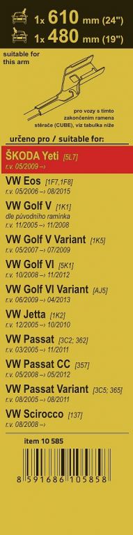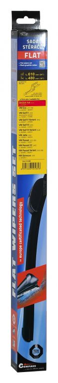 Sada dvou plochých stěračů FLAT (řidič + spolujezdec) se speciálním uchycením. Délky stěračů a systém uchycení na ramínko jsou přizpůsobeny vybraným vozům (viz tabulka použití).Vysoce kvalitní pružný člen plochého stěrače zajišťuje stejnoměrný tlak grafitového břitu v celé jeho délce.