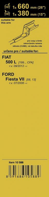 Sada dvou plochých stěračů FLAT (řidič + spolujezdec) se speciálním uchycením. Délky stěračů a systém uchycení na ramínko jsou přizpůsobeny vybraným vozům (viz tabulka použití). Vysoce kvalitní pružný člen plochého stěrače zajišťuje stejnoměrný tlak grafitového břitu v celé jeho délce.