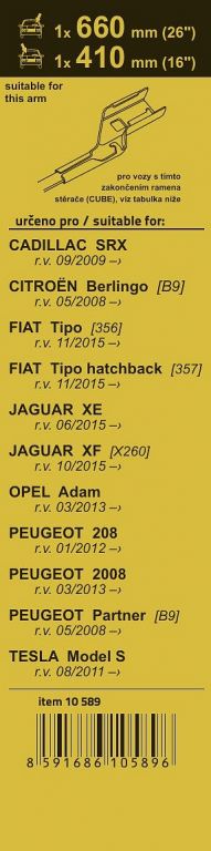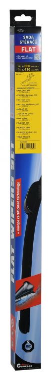 Sada dvou plochých stěračů FLAT (řidič + spolujezdec) se speciálním uchycením. Délky stěračů a systém uchycení na ramínko jsou přizpůsobeny vybraným vozům (viz tabulka použití). Vysoce kvalitní pružný člen plochého stěrače zajišťuje stejnoměrný tlak grafitového břitu v celé jeho délce.