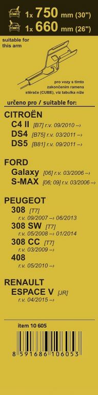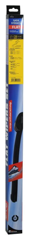 Sada dvou plochých stěračů FLAT (řidič + spolujezdec) se speciálním uchycením. Délky stěračů a systém uchycení na ramínko jsou přizpůsobeny vybraným vozům (viz tabulka použití). Vysoce kvalitní pružný člen plochého stěrače zajišťuje stejnoměrný tlak grafitového břitu v celé jeho délce.